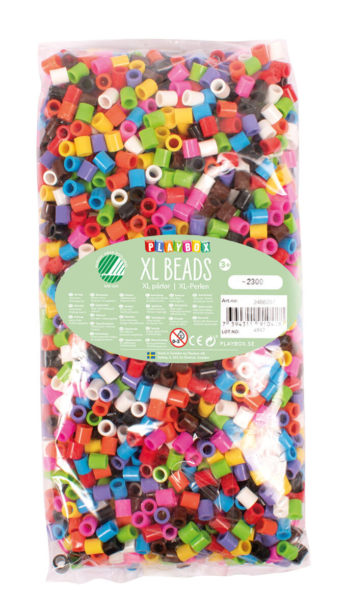 950 st/fp. XL-pärlor i tio olika färger. ø 9 mm. Håldia 5 mm. Kan strykas ihop. Levereras i transparent hink med lock för praktisk förvaring. Pärlorna är tillverkade av sockerrör och är 100 % återvinningsbara. Går att använda till pärlplattor. PVC-fri. Från 3 år.