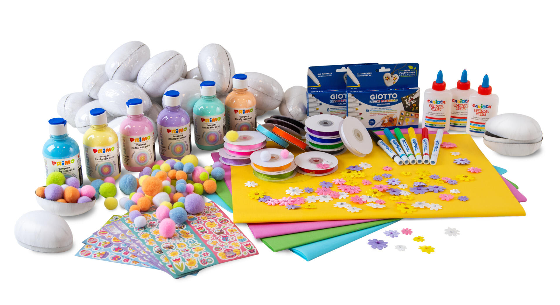 17 produkter för ca 20 barn. Stort skapapaket för att tillverka och dekorera ditt egna påskägg. Innehåller 45423 Organzaband, 122134 klistermärken påsk, 77951 Ägg av papp (20 st) , 47340 silkespapper i 4 färger, 130297 Tygblommor, 146869 Pompoms pastell, 130866 skollim, 142397 Giotto dekorpennor, 164018 Pastellfärg (6 färger). PVC-fri.