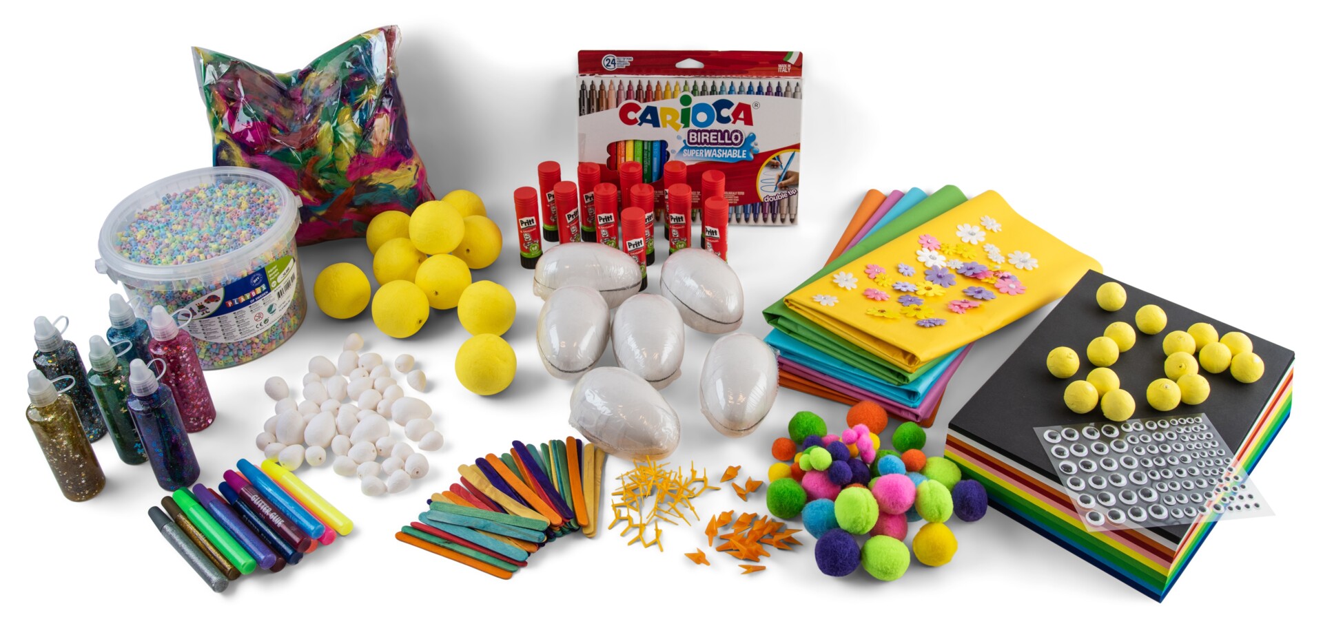 Stort set med allt du behöver för kreativt skapande eller för arbete med loose parts. Innehåller 80 piprensare, 600 plastögon i olika storlekar, 200 g paljetter i olika färger och former, 200 g facettslipade paljetter, 100 g fjädrar, 500 g knappar, 500 st pompom i blandade storlekar och färger, 230 st färgade glasspinnar och 90 st glittriga piprensare. Allt levereras i en praktisk plastback, perfekt för att flytta med i verksamheten, både inom- och utomhus. Mått på backen 40x30x19 cm. Från 3 år. PVC-fri.