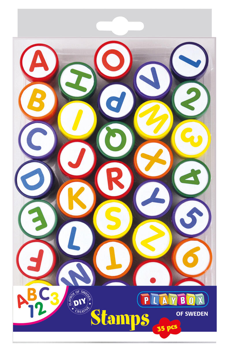 35 delar/fp. Stämplar med bläck, bokstäver A-Z och siffror 0-9. En av varje tecken. Blandade färger gul, orange, röd, lila, blå, grön. CE-märkta. Från 3 år, innehåller smådelar. Av ABS och polypropen.