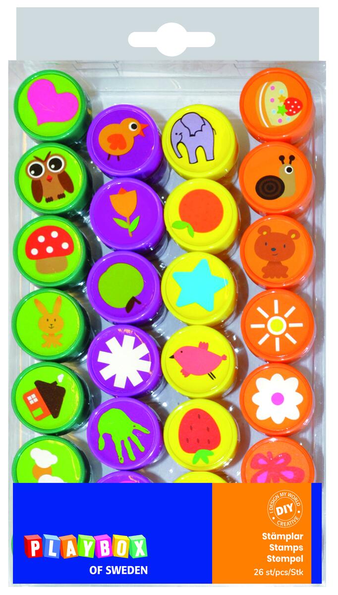 35 delar/fp. Stämplar med bläck, bokstäver A-Z och siffror 0-9. En av varje tecken. Blandade färger gul, orange, röd, lila, blå, grön. CE-märkta. Från 3 år, innehåller smådelar. Av ABS och polypropen.