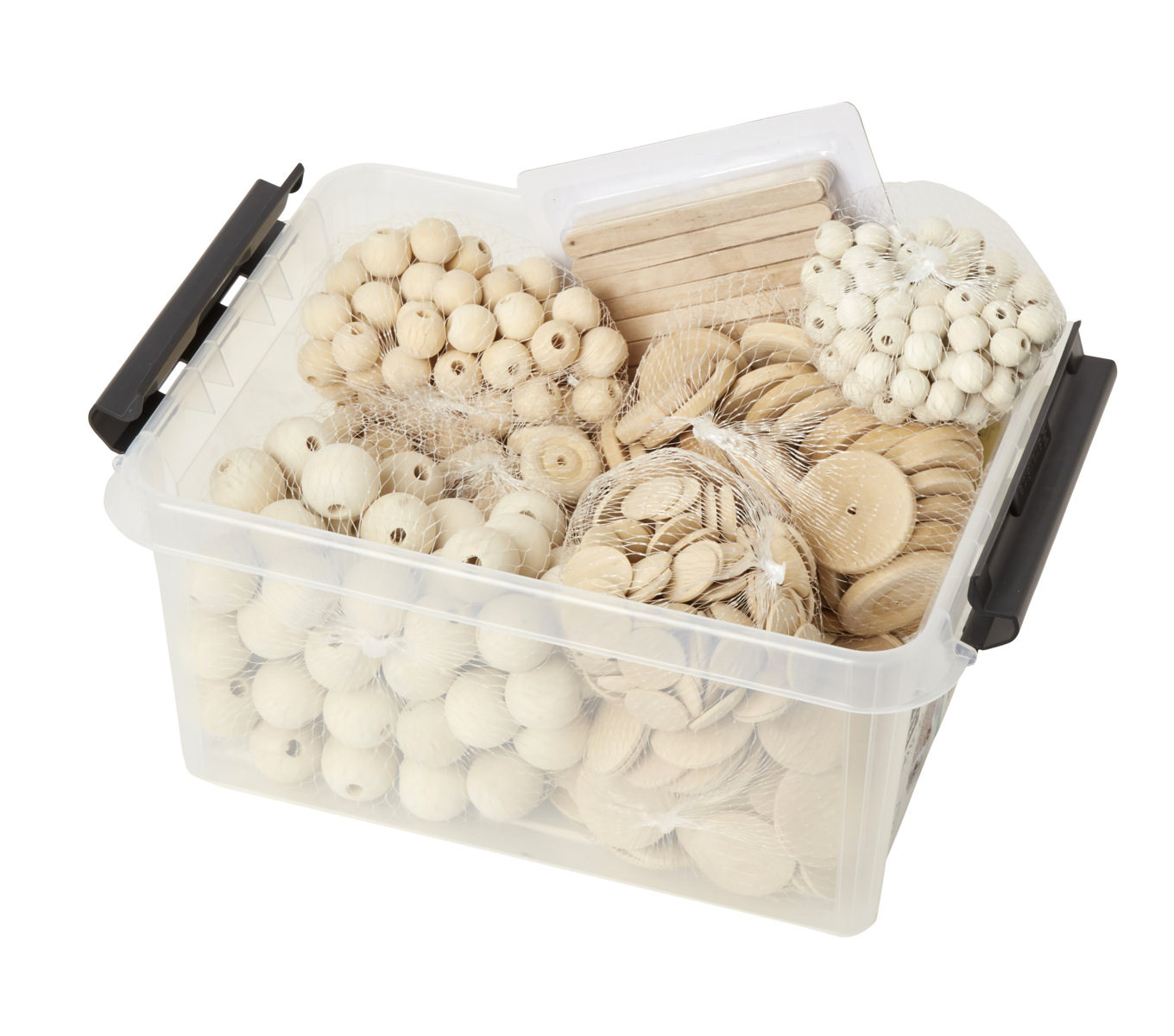 Startpaket med allt du behöver för att komma ingång med skapande i trämaterial. Innehåller 250 träkulor i tre storlekar: 15, 20 och 20 mm, 150 trähjul i två storlekar: 34 och 50 mm, 200 knappformar i två storlekar: 25 och 40 mm samt 96 glasspinnar. Allt levereras i en praktisk plastback, perfekt för att flytta med i verksamheten, både inom- och utomhus. Mått på backen 34x25x16 cm. Från 3 år. PVC-fri.