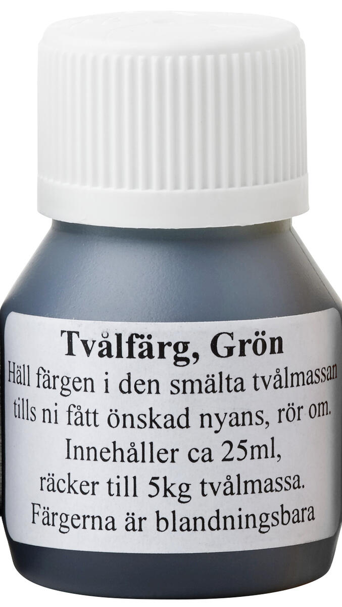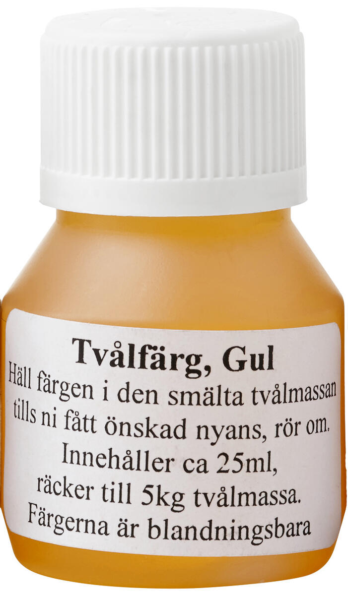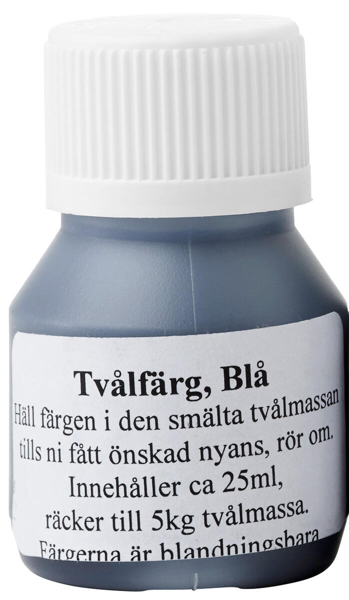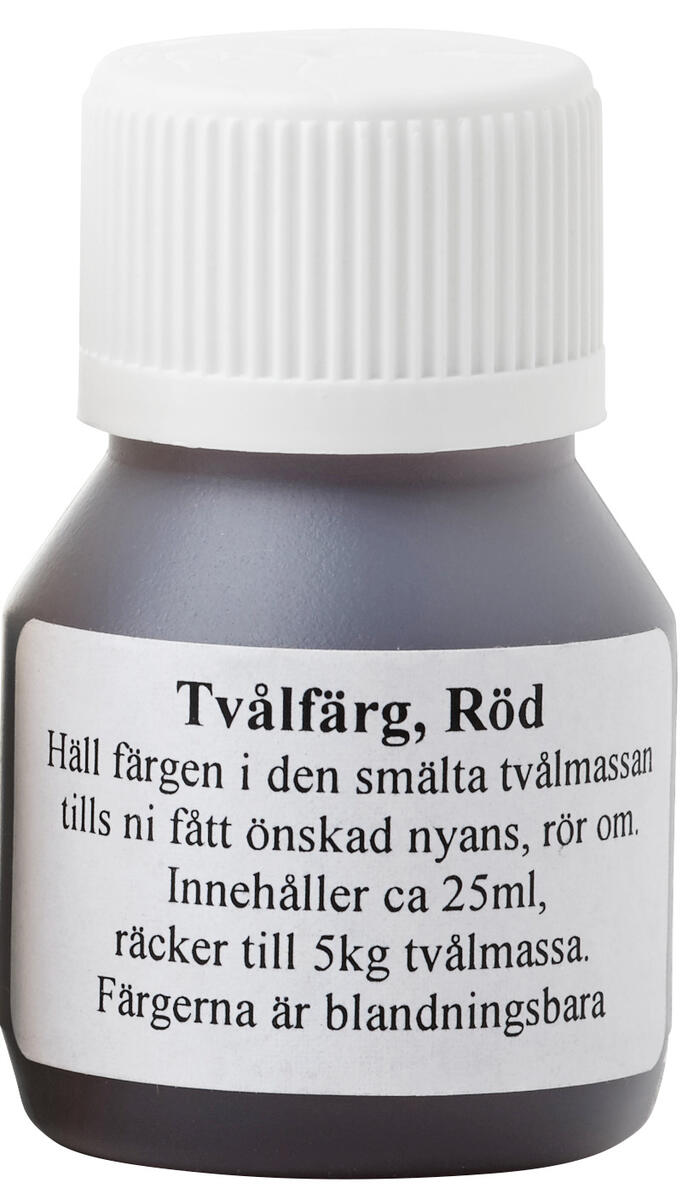 25 ml tvålfärg till transparent tvålmassa i återförslutningsbara flaskor. För opak tvål eller ljusare pastellfärger blandas valfri tvålfärg med vitt färgpulver.