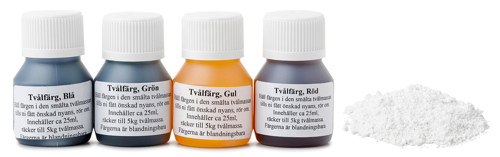 25 ml tvålfärg till transparent tvålmassa i återförslutningsbara flaskor. För opak tvål eller ljusare pastellfärger blandas valfri tvålfärg med vitt färgpulver.