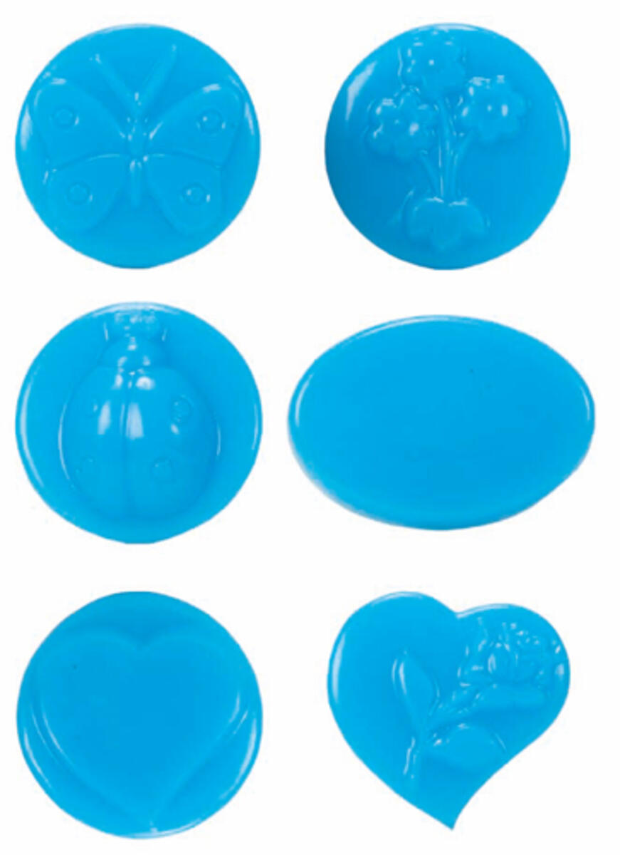 Form med 6 motiv: sköldpadda, fisk, blomma, hjärta, snäcka samt traditionellt formad tvål. Åtgång ca: 250 g tvålmassa till alla formar. Hela formen är 25x18,5 cm. Mått på en tvål ca 5x7 cm.