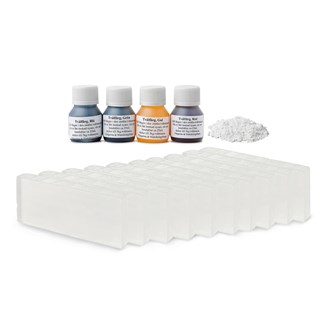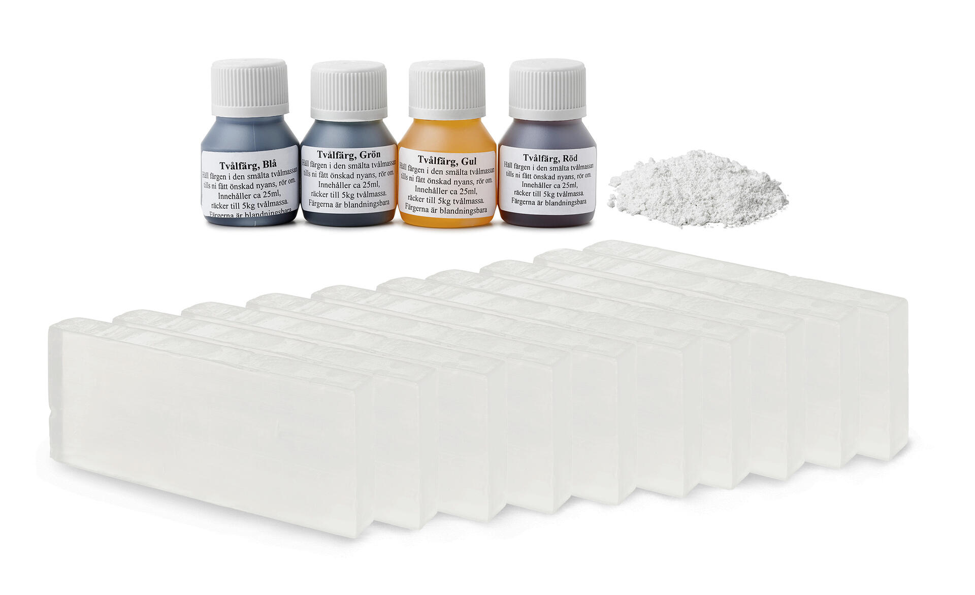5 kg Transparent tvålmassa i block samt 25 ml tvålfärg i rött, gult, blått, grönt och vitt. Smälts och stöps i formar. Vit tvålfärg gör tvålen opak, övriga färger transparenta. Räcker till ca 150 små tvålar.