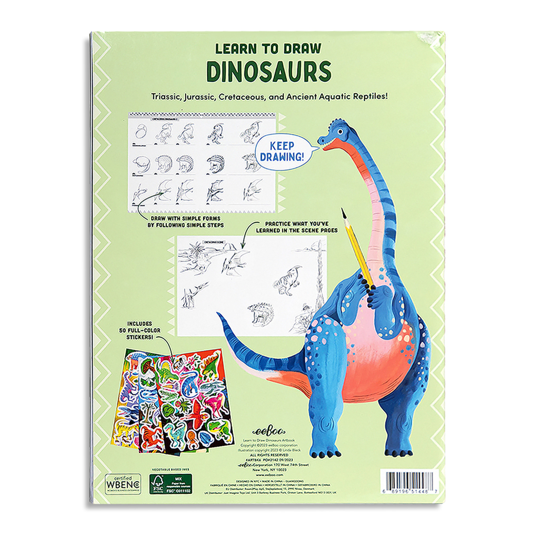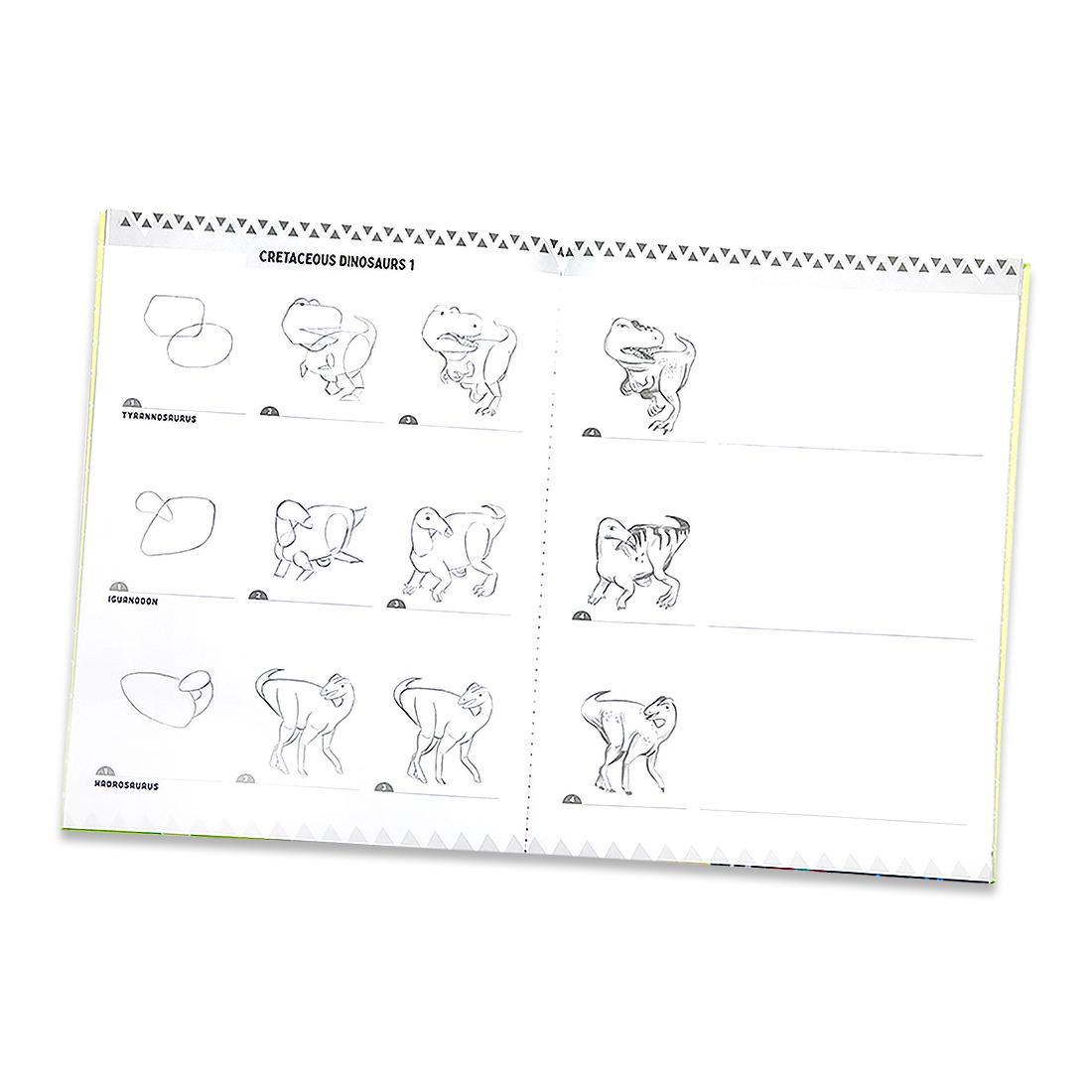En bok med enkla instruktioner om hur man ritar olika dinosaurier. Innehåller illustrationer om hur man gör steg för steg, och plats att öva på. Innehåller även 50 färgglada stickers med de olika dinosaurierna, samt bild på olika perioder där de kan placeras ut. Engelsk text. 32 sidor.