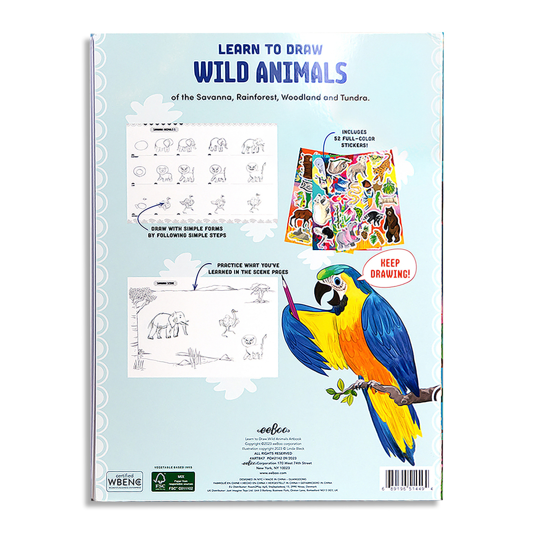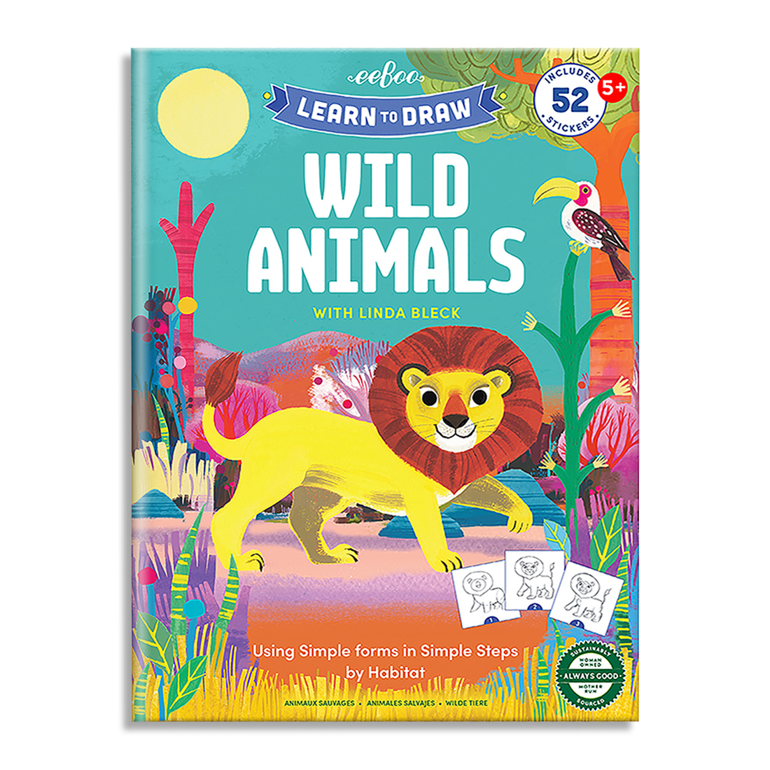 En bok med enkla instruktioner om hur man ritar olika vilda djur. Innehåller illustrationer om hur man gör steg för steg, och plats att öva på. Innehåller även 50 färgglada stickers med de olika djuren, samt bild på olika områden där de kan placeras ut. Engelsk text. 32 sidor.