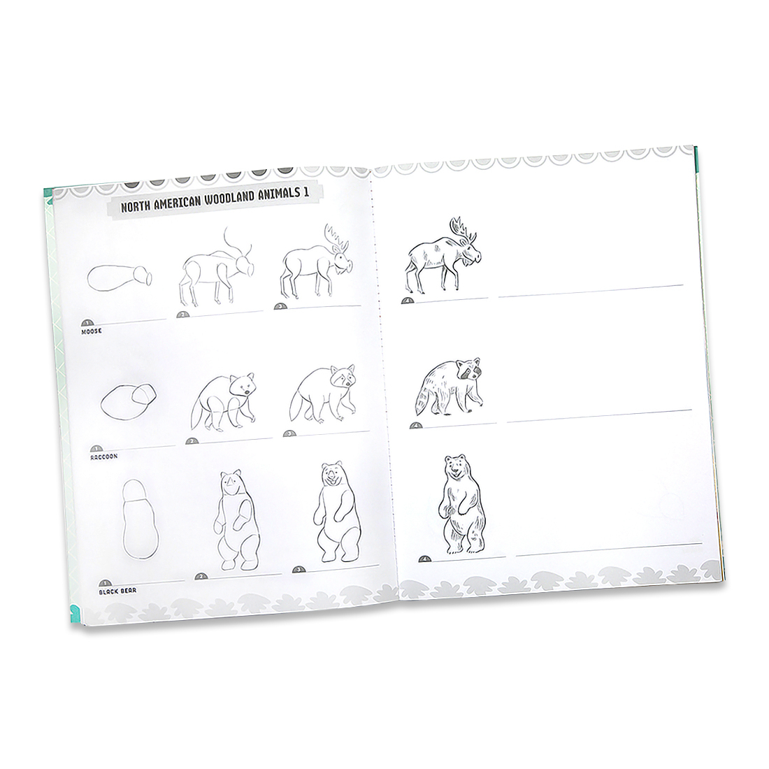 En bok med enkla instruktioner om hur man tecknar djur. Olika djur i rörelse, eller i varierade vinklar. Innehåller illustrationer och text om hur man gör steg för steg, och plats att öva på. Engelsk text. 32 sidor.