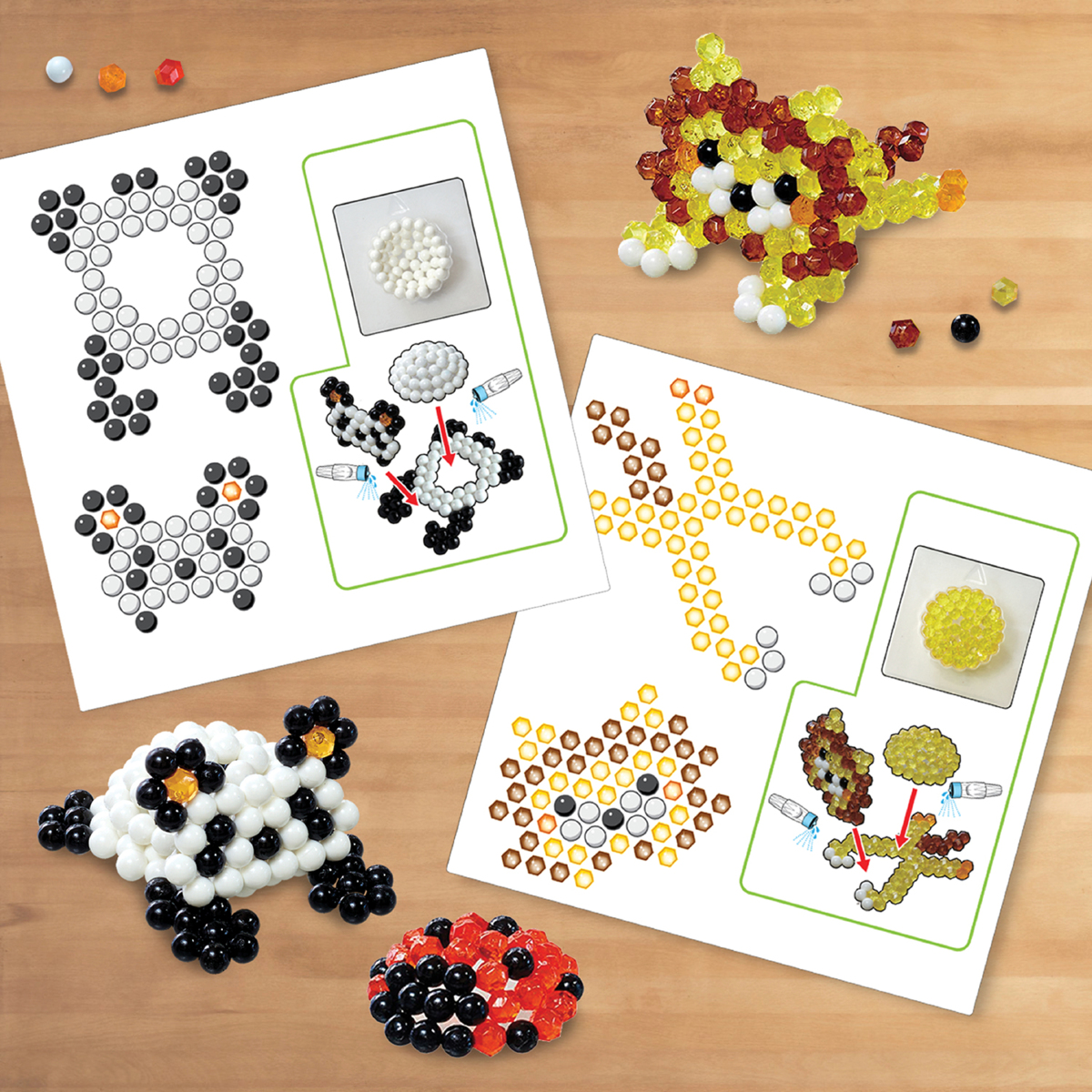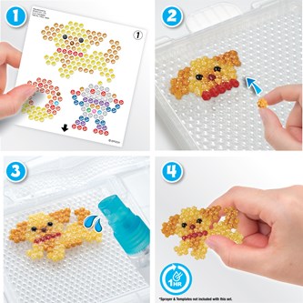2 400 pärlor/fp. Aquabeads är små pärlor som klibbar ihop med vatten. Ingen strykning behövs. Pärla ditt mönster, spraya på vatten och pärplorna kommer hålla formen efter att ha torkat helt. 2 400 pysselpärlor i 24 färger. Levereras i en praktisk box. Måste kompletteras med 146331 Pärlplatta Flip. Från 4 år.