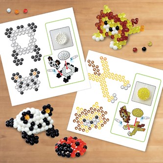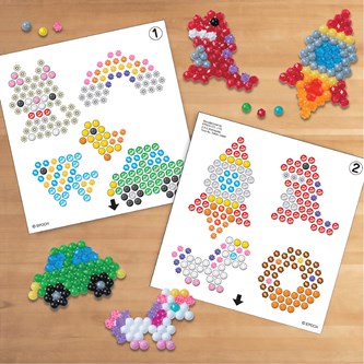 800 pärlor/fp. Aquabeads är små pärlor som klibbar ihop med vatten. Ingen strykning behövs. Pärla ditt mönster, spraya på vatten och pärlorna kommer hålla formen efter att ha torkat helt. 800 pärlor i 8 olika färger. Måste kompletteras med 146331 Pärlplatta Flip. Från 4 år.