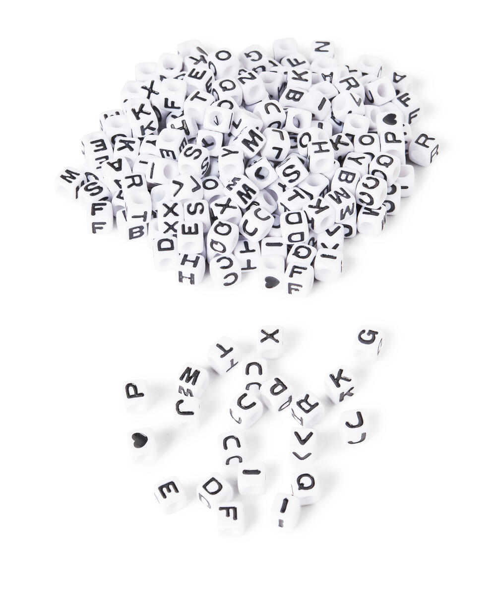 500 st/fp. Ca 70 g/fp. Runda alfabetspärlor A-Ö. Svarta bokstäver på vit botten. Bokstäverna är nedsänkta i pärlan vilket gör att färgen håller längre. ø 7,5 mm. Håldiameter 1,3 mm. Av akrylplast. PVC-fri. Från 3 år.