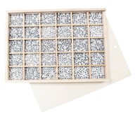 Ca 1 500 st/fp. Storpack med bokstavs- och sifferpärlor för att skapa personliga armband och halsband. Vita kubpärlor med svarta bokstäver. Mått: 7x7x7 mm. Pärlorna levereras i trälåda med lock för praktisk förvaring. Hela nordiska alfabetet samt siffror 0-9. Av akrylplast. Mått Låda 36x26x30 cm