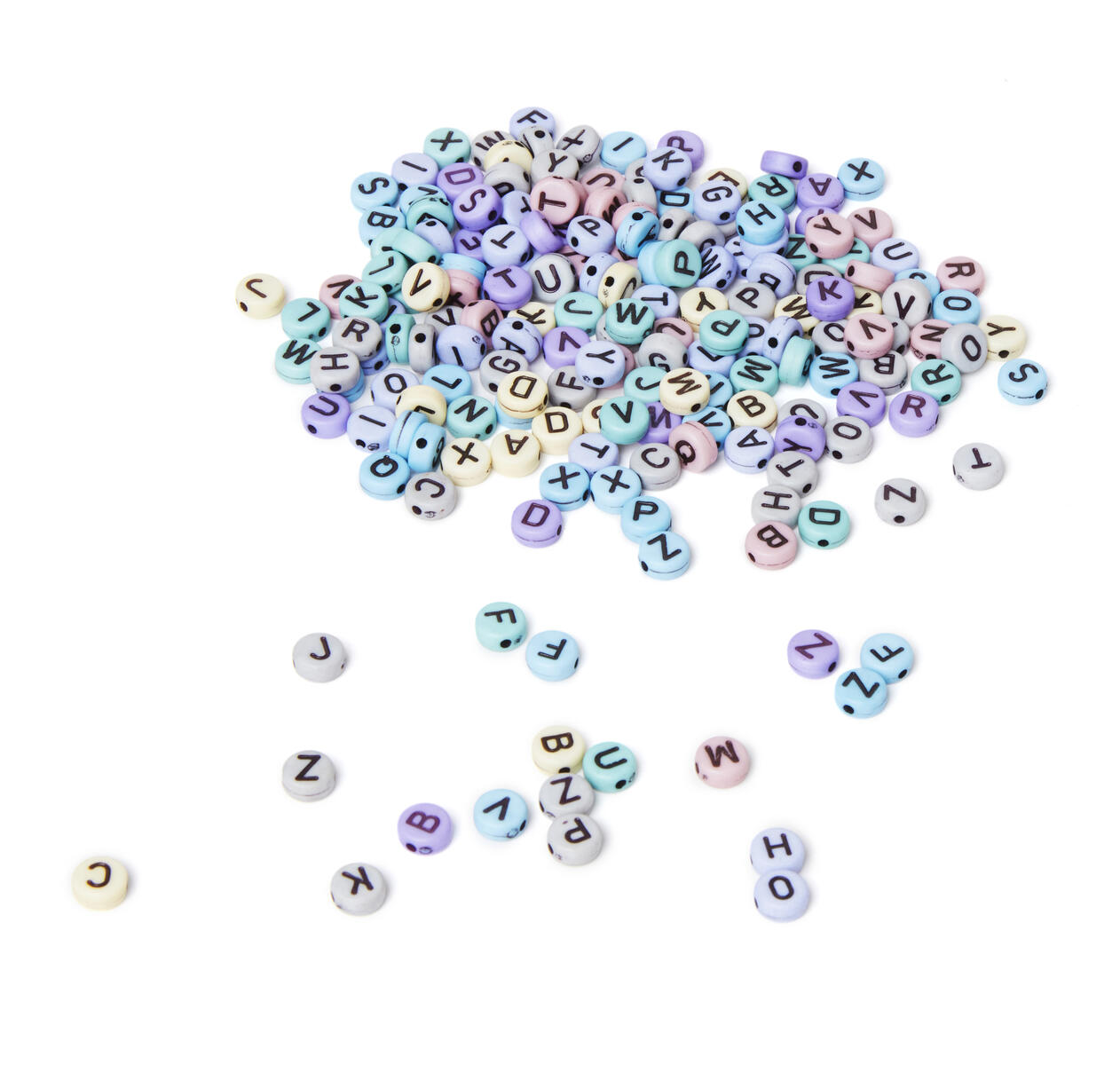 750 st/fp. Runda alfabetspärlor A-Z. Svarta bokstäver på pastellfärgad botten. Bokstäverna är nedsänkta i pärlan vilket gör att färgen håller längre. ø 7,5 mm. Håldiameter 1,3 mm. Av PS. PVC-fri. Från 3 år.