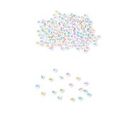 1 000 st/fp. Plastkuber med siffror, nordiska alfabetet A-Ö och små hjärtan i fina transparenta färger. Mått: 6x6 mm. Håldiameter 3 mm. Av akrylplast. PVC-fri. Från 3 år.