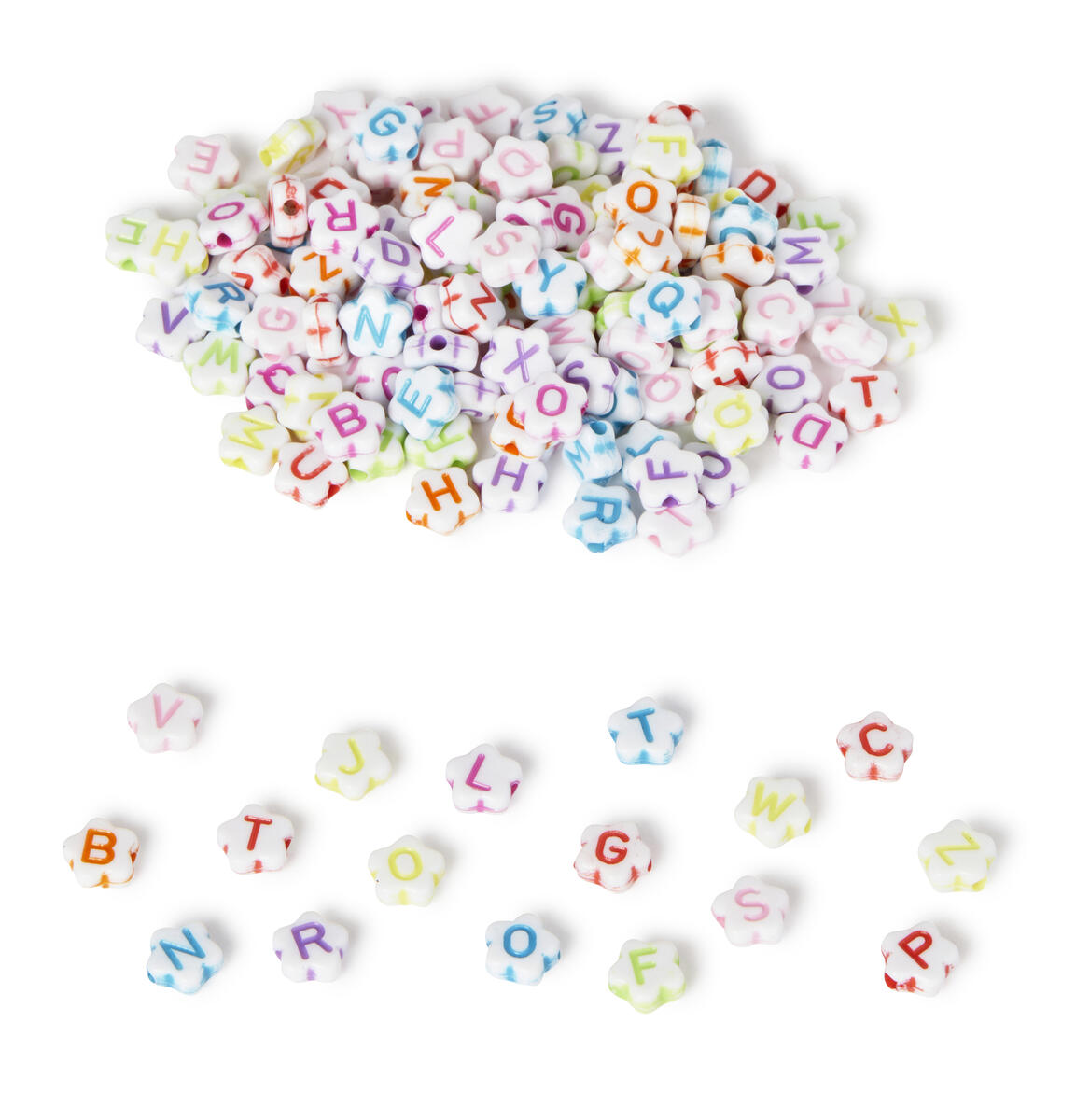 500 st/fp. Ca 70 g/fp. Runda alfabetspärlor A-Ö. Färgade bokstäver på vit botten. Bokstäverna är nedsänkta i pärlan vilket gör att färgen håller längre. ø 7,5 mm. Håldiameter 1,3 mm. Av Akrylplast. PVC-fri. Från 3 år.