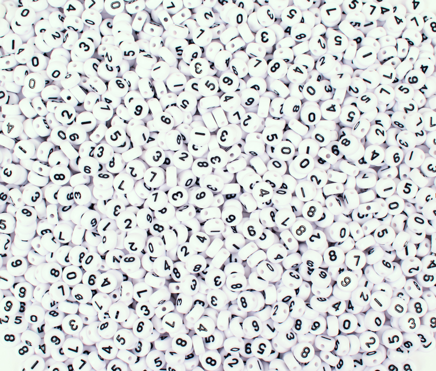 500 st/fp. Runda sifferpärlor 0-9. Svarta siffror på vit botten, nedsänkta i pärlan vilket gör att färgen håller längre. ø 7 mm. Håldiameter 1,3 mm. Av akrylplast. PVC-fri. Från 3 år.