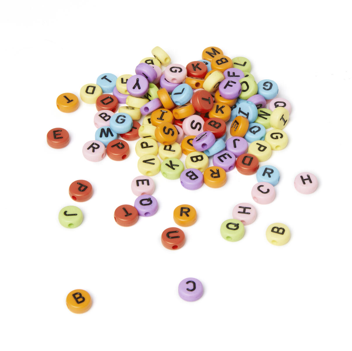 500 st/fp. Ca 70 g/fp. Runda alfabetspärlor A-Ö. Färgade bokstäver på vit botten. Bokstäverna är nedsänkta i pärlan vilket gör att färgen håller längre. ø 7,5 mm. Håldiameter 1,3 mm. Av Akrylplast. PVC-fri. Från 3 år.