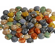 100 st/fp. Pärlor av keramik i blandade färger och former. 6 olika färger i 3 olika modeller. 12 mm. Håldiameter 1 mm.