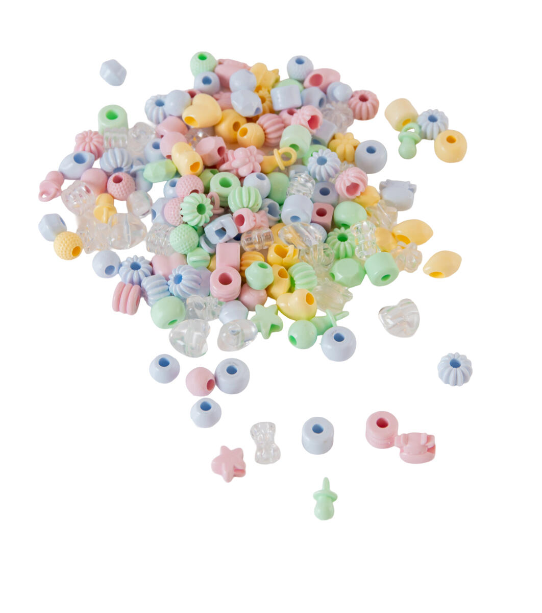 1 kg/fp. Ca 3 500 pärlor. Stor pärlmix med blandade färger och figurer. 9-18 mm. Håldiameter 2-4 mm. Av polystyren. Levereras i plastburk med lock. PVC-fri. Från 3 år.
