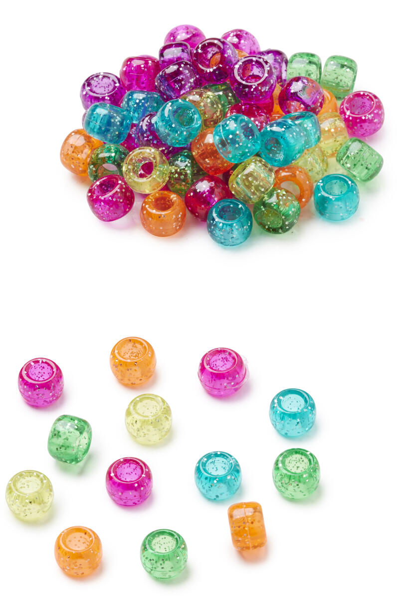 450 g/fp. Ca 5 100 pärlor/fp. Små kongopärlor i transparenta klara färger. ø 6 mm, ø hål ca 3 mm. Av polystyren. Levereras i hink med lock för praktisk förvaring. PVC-fri. Från 3 år.