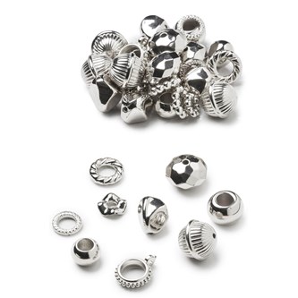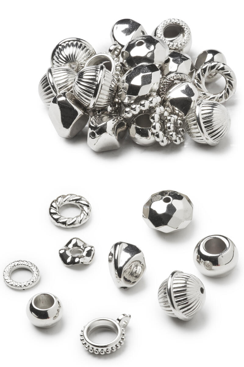 Ca 180 st/fp. Metalliknande 10-20 mm stora pärlor och 10-15 mm stora ringar i 12 olika modeller och storlekar. Mycket dekorativa i kombination med andra pärlor. Håldiameter 2 mm. Av polystyrenplast.