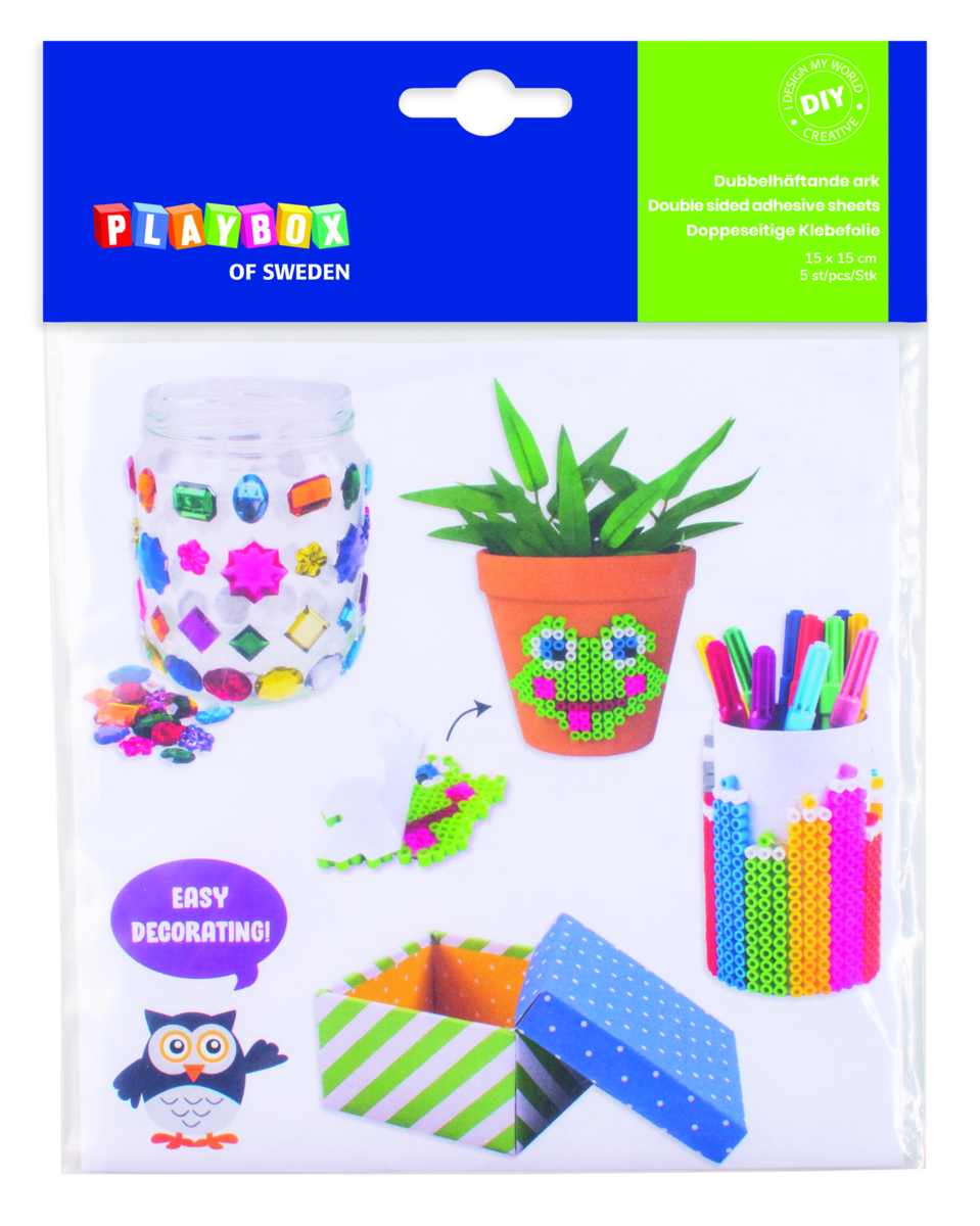 5 st/fp. Skapa pärlplattor utan att behöva stryka dem eller använd till papperspyssel och scrapbooking. Dra av skyddsplasten på den ena sidan av arket och fäst på pärlmotivet. Tryck och gnugga för så att arket fäster på alla pärlor. Klipp till kanten på arket och ta sedan bort det sista lagret av skyddspappret. Fäst motivet på önskad yta. Klistret fäster på de flesta material men var noga med att ej placera tejpen på känsliga ytor då den är svår att avlägsna. Mått: 15x15 cm.