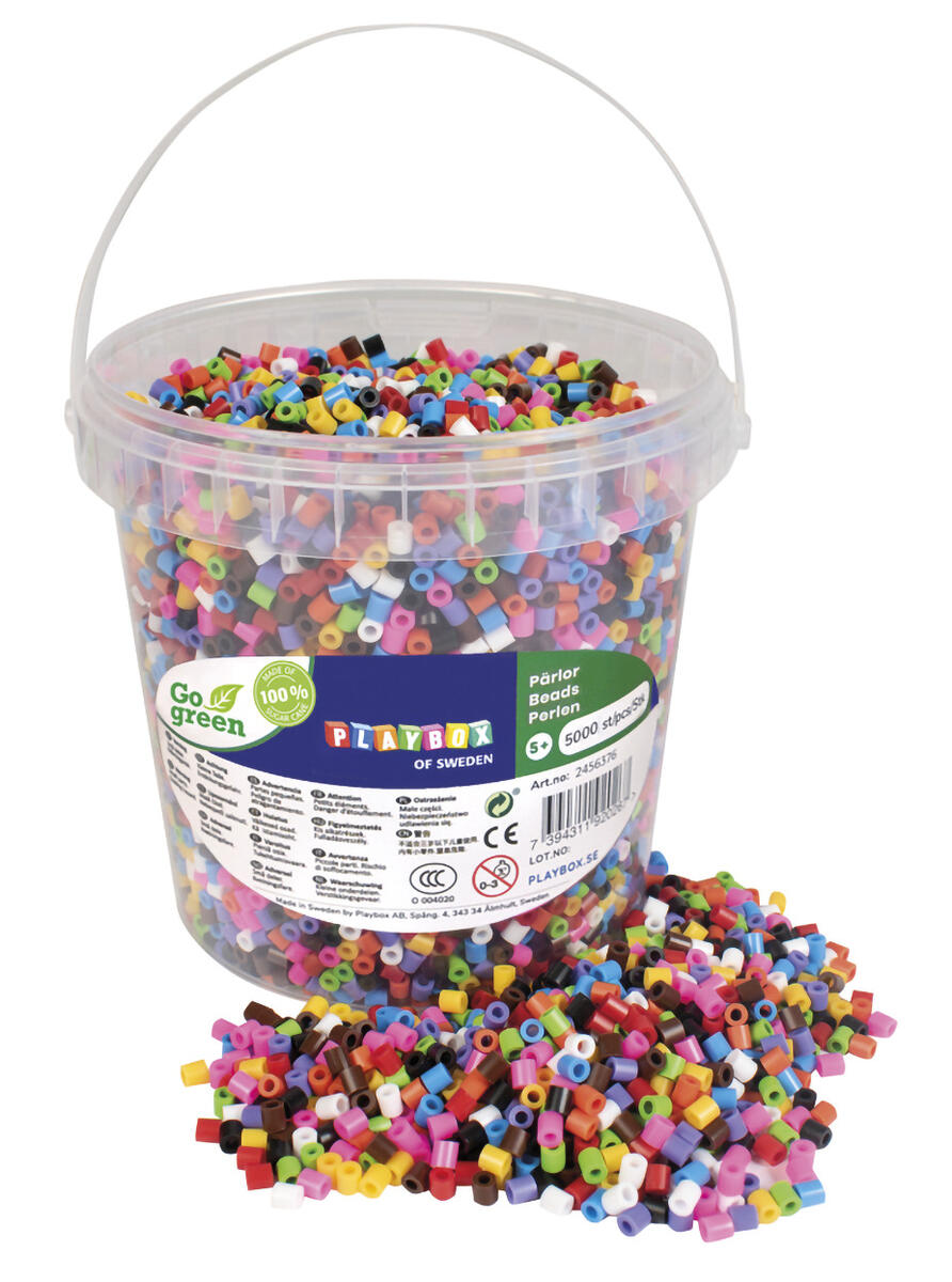 5 000 st/fp. Rörpärlor i tio olika färger. ø 5 mm, ø hål 2,5 mm. Kan strykas ihop. Levereras i transparent hink med lock för praktisk förvaring. Pärlorna är tillverkade av sockerrör och är 100 % återvinningsbara. Går att använda till pärlplattor. PVC-fri. Från 3 år.