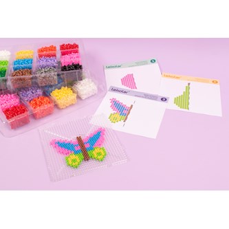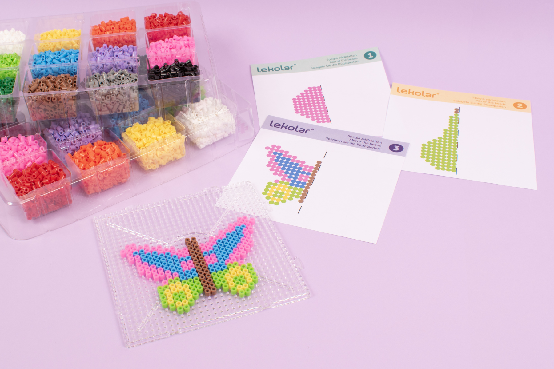 1 set/fp. Låt barnen träna på att skapa symmetriska mönster. De tar ett mönsterkort (halva objektet finns beskrivet) och börjar lägga ut pärlorna på pärlplattan enligt beskrivningen. När de gjort klart den beskrivna halvan speglar de mönstret och pärlar klart den andra halvan. Utvecklar barnens förståelse för symmetri och tränar finmotoriska färdigheter. Innehåller 2 tråg med totalt 8 000 rörpärlor (LDPE) i 12 olika färger, färgsorterade i fack. 5 st pärlpattor (PS) 15x15 cm, 2 strykpapper, 16 motivkort samt instruktion.