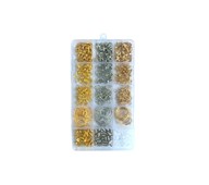 580 delar/fp. Innehåller karbinlås, böjringar, knuttäckare med ögla, halsbandslås skruvmodell, fiskkrokar, kreolörhängen, ringar och stoppar till örhängen, allt i tre olika färger. Silverpläterade, guldpläterade och roséguldpläterade. Undvik kontakt med saltvatten. Nickelfri. Från 3 år. PVC fri.