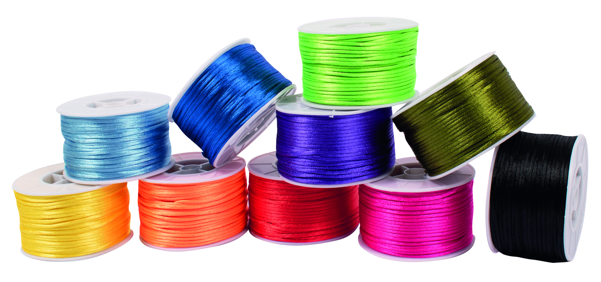 10 x 50 m/fp. Satinsnöre i fin blank kvalitet. Ø 2 mm. Innehåller 10 basfärger. 1 rulle/färg. 50 m/rulle. Av PP och polyester.