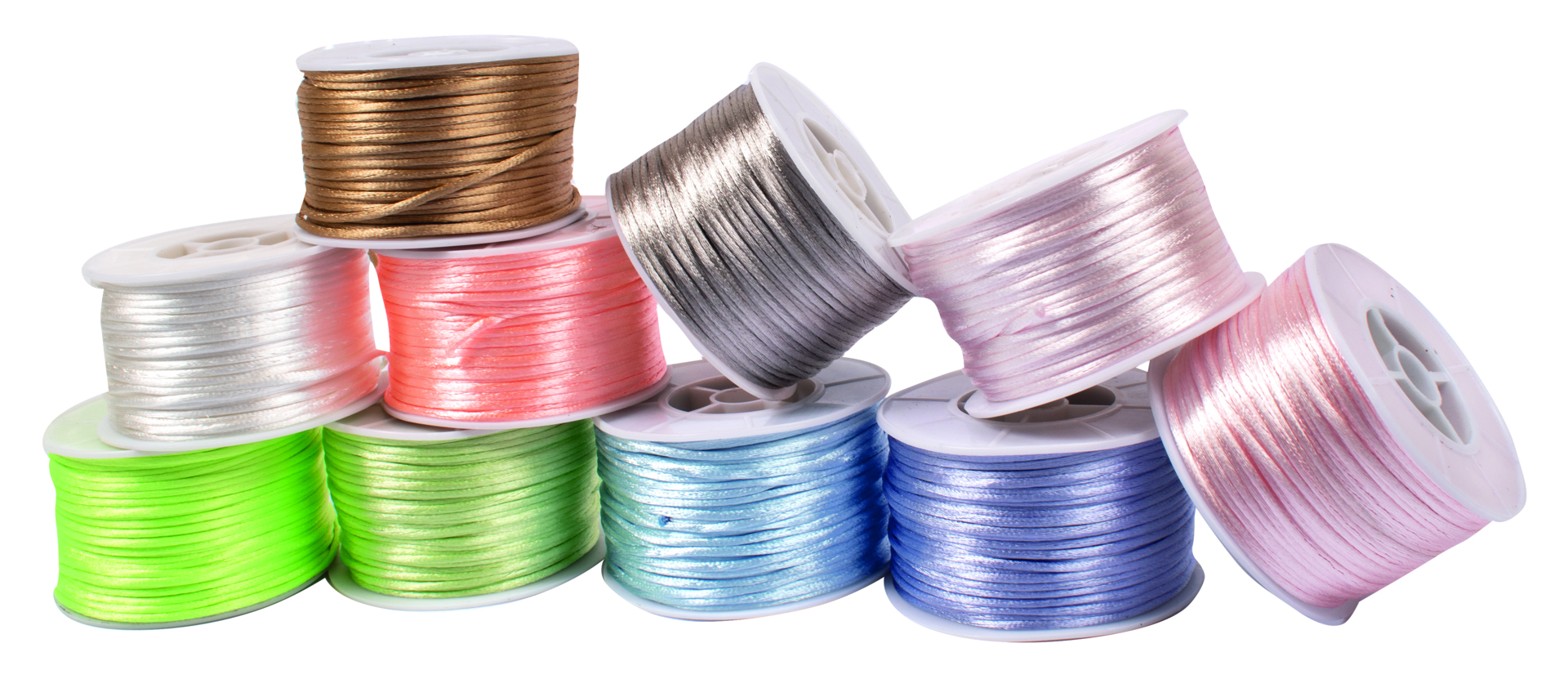10 x 50 m/fp. Satinsnöre i fin blank kvalitet. Ø 2 mm. Innehåller 10 basfärger. 1 rulle/färg. 50 m/rulle. Av PP och polyester.