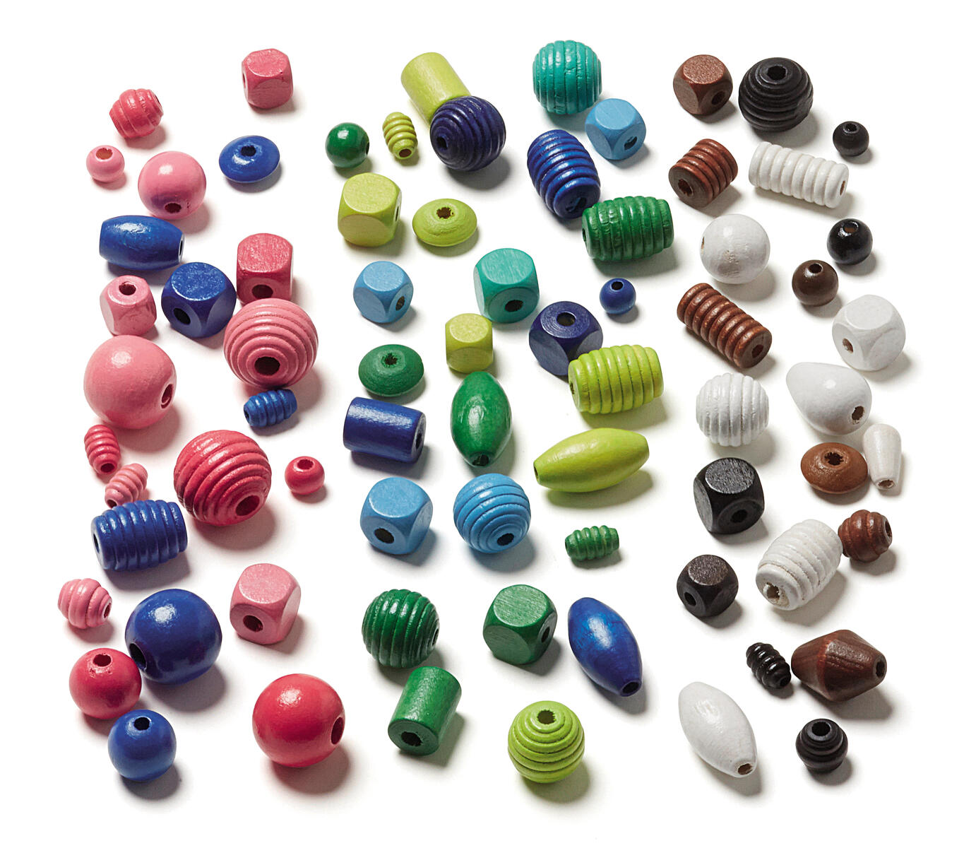 300 st/fp. Träpärlor i olika färger. ø 10, 8 och 5 mm. Hål 1,5-2 mm. Av FSC-märkt trä. PVC-fri. Från 3 år.
