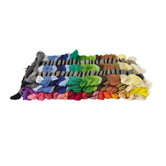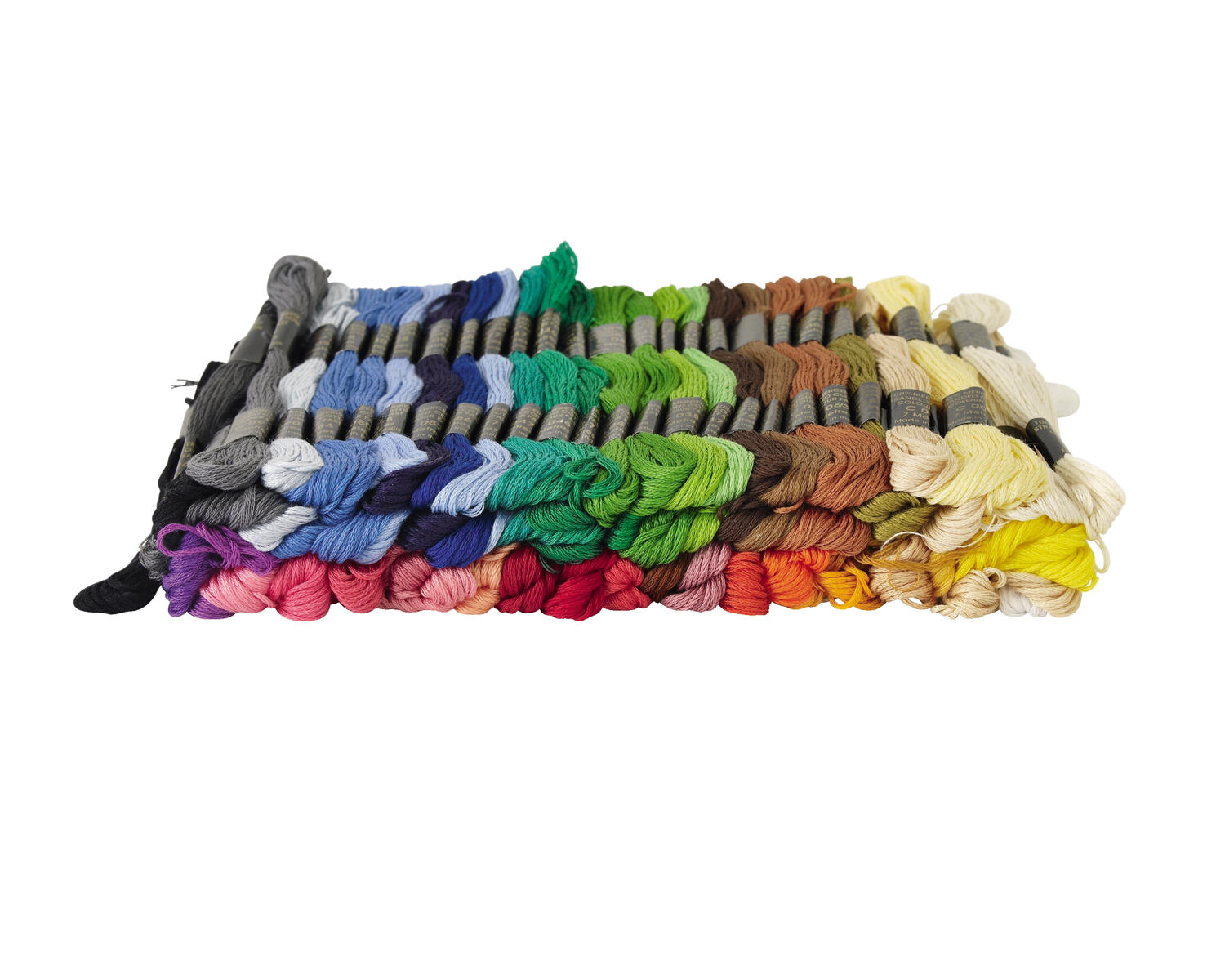 100 st/fp. 100 % bomull. 2 garndockor. 50 st färger. 7 m/docka. Tvinnat med 6 trådar. PVC-fri.