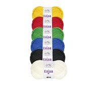 6 kg/fp. Stickor 4 mm. Masktäthet 20 m = 10 cm. Tvättråd: 40 ºC. 20 nystan x 50 g/färg i följande färger: gul, röd, blå, grön, svart och vit. Av 100% akryl som är OEKO-TEX®-certifierad, klass I (Standard 100).