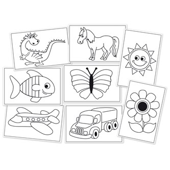 48 kort/fp. Sykort med förtryckta motiv som kan färgläggas och broderas. Innehåller 6 kort vardera av de 8 motiven häst, fisk, fjäril, drake, sol, blomma, flygplan och lastbil. Mått 17x11 cm. Tillverkade av stadig 300 g kartong