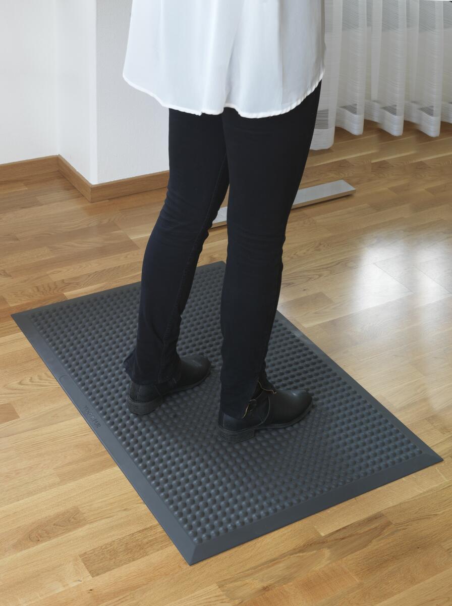 Arbetsmattan har en bulformad ovansida som ger utmärkt avlastning vid stående arbete. De stora knottrorna ger skön ståkomfort och ökar blodcirkulationen. Färg: antracitgrå. Speciellt lämplig för arbetsplatser med begränsat utrymme. Mått: 60x45 cm. Stålsatsens mått: 66x51 cm. Rengörs med fuktig golvtrasa.