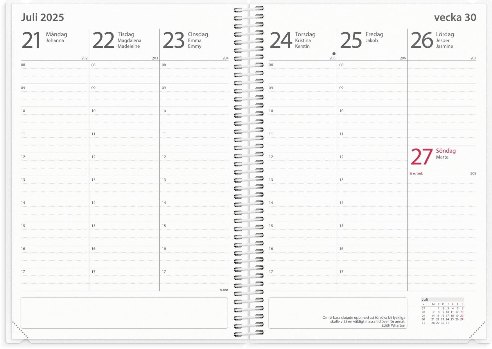 Kalender med omslag i återvunnen PP-plast, gummiband. Utbytbart motiv i plastficka. Veckouppdatering med timindelning 8-17. Årsplaner, barnförteckning, veckoschema, telefonregister, frånvaro och kartor. Flyttbara flikar. Mått: 16x21,5 cm. Spiralbunden. FSC.