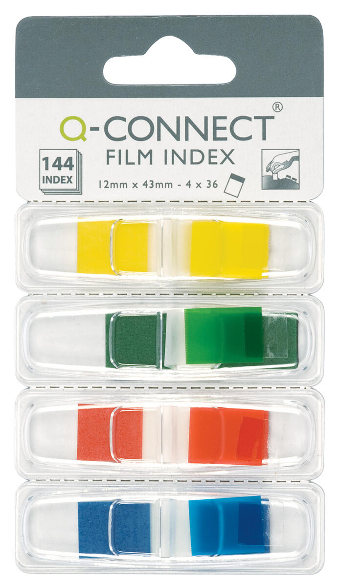 4 färger/fp. 35 flikar/färg. Film Index transparenta märkflikar i klara färger. Praktisk, individuell dispenser per färg. Enkel att lossa och flytta runt i dokument. Innehåller färgerna gul, grön, röd och blå. Flikarnas mått: 12x43 mm.