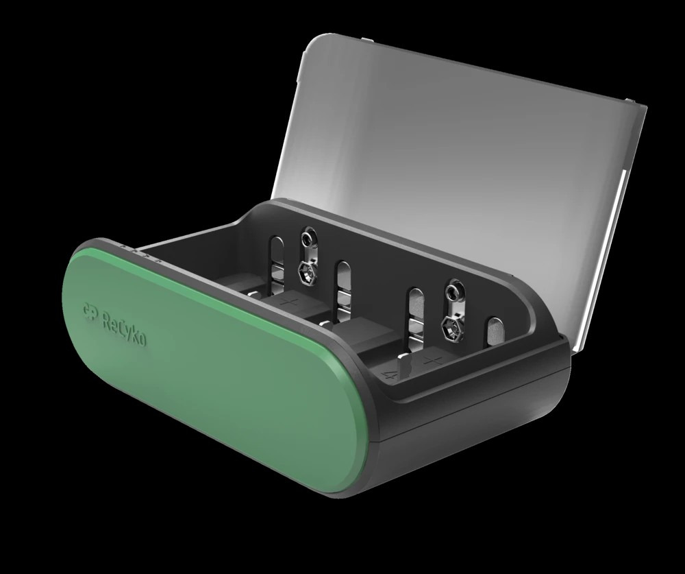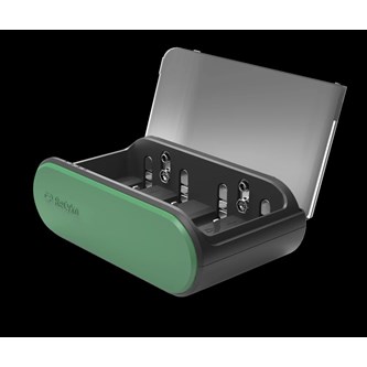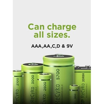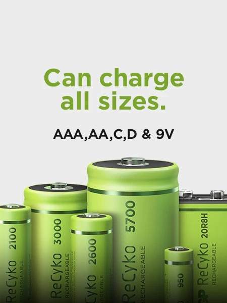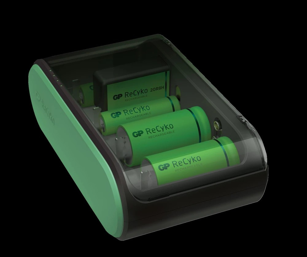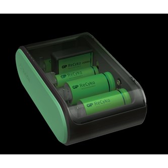 Snabbladdare med vilken man kan ladda både AA och AAA batterier. 4 AA-batterier medföljer till produkten. LED-dioder indikerar laddstatus samt om dåliga batterier sätts i laddaren. Stängs av när batterierna är fulladdade. Kan användas som fodral och håller batterierna skyddade. Fungerar med USB eller valfri GP ReCyko laddstation.