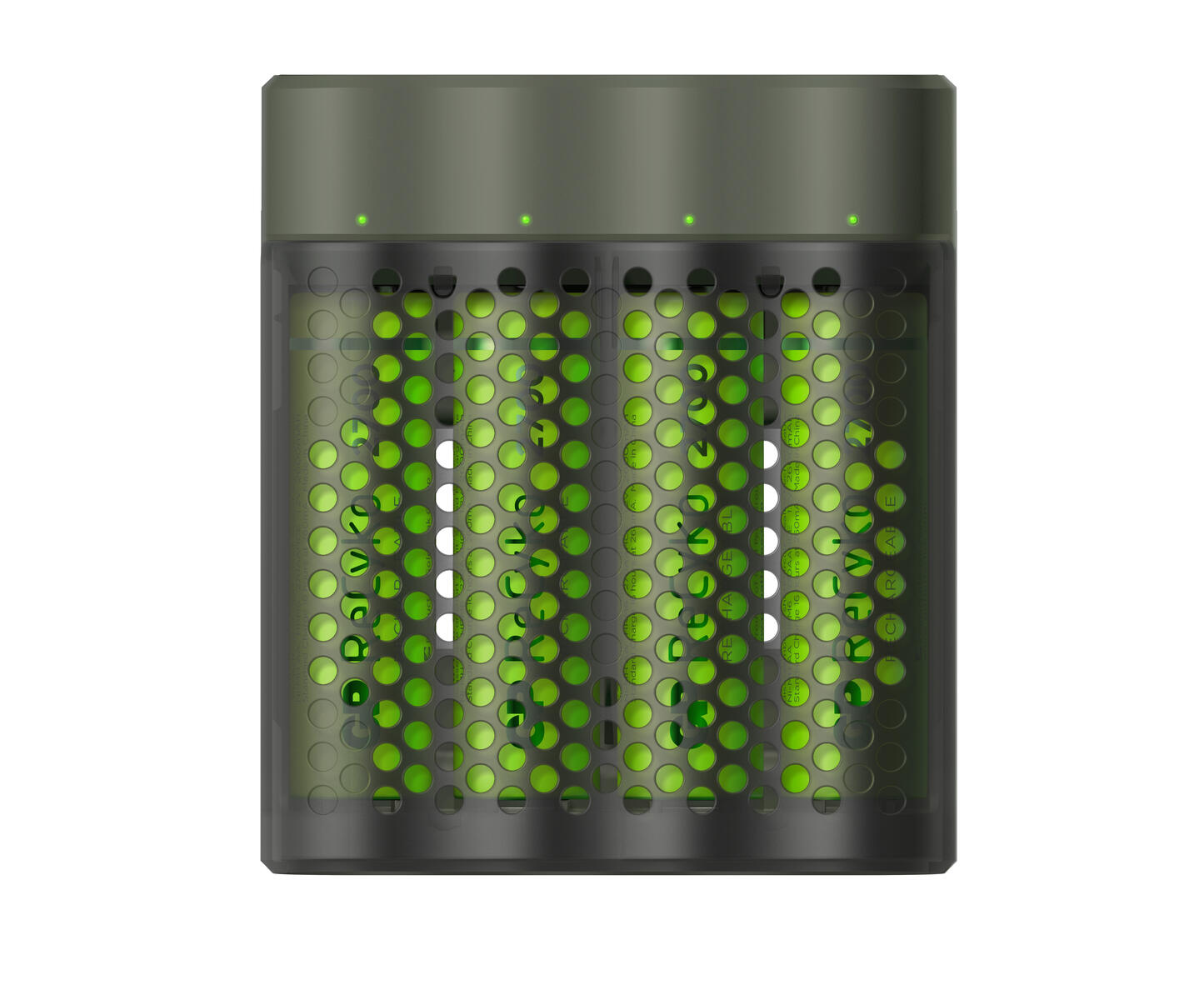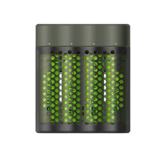Snabbladdare med vilken man kan ladda både AA och AAA batterier. 4 AA-batterier medföljer till produkten. LED-dioder indikerar laddstatus samt om dåliga batterier sätts i laddaren. Stängs av när batterierna är fulladdade. Kan användas som fodral och håller batterierna skyddade. Fungerar med USB eller valfri GP ReCyko laddstation.