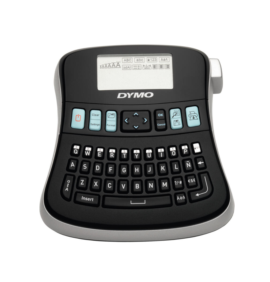 LabelManager 210D. Etikettskrivare för skrivbordet som är enkel att använda. Skriver ut etiketter på 6, 9 och 12 mm D1-tejp med en eller två rader per etikett (på 9 mm tejp). Lagrar upp till 9 etiketter och erbjuder möjligheten att infoga sparad text. Drivs av 6 AA-batterier (ingår ej). Adapter ingår ej men finns som tillbehör (28789).