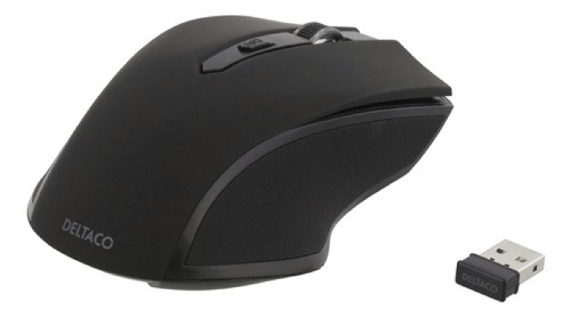 1 st/fp. Ergonomisk trådlös mus från DELTACO med stabil uppkoppling upp till 10 meter. Anslut mottagaren till en ledig USB-port och sätt i ett AA-batteri (medföljer ej). Den har 6 knappar inklusive scrollhjul. Uppdateringsfrekvensen är 125 Hz. Viloläge efter 1 minut och automatisk avstängning efter 8 minuter. Mått: D125xB78xH40 mm.