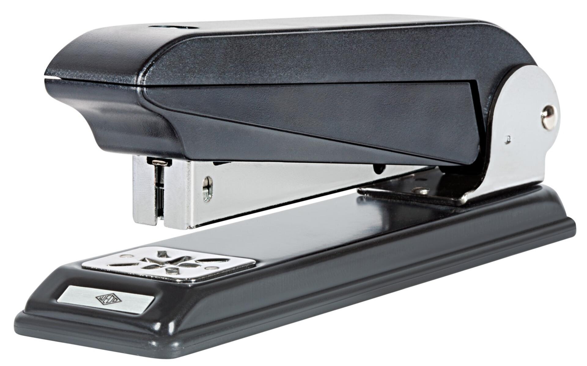 Samtliga delar av stål, förkromat häfthuvud, nit- och nålhäftning. Gapdjup 105 mm. Kapacitet 50 ark, längd 180 mm. Svart. Laddbar med klammer 24/6 art.nr 27724 eller 26/6 art.nr 27721.