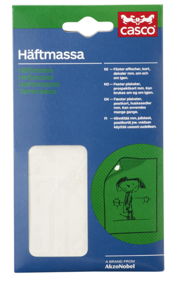 Häftmassa fäster meddelanden, affischer och andra lätta föremål på olika underlag. Doftfri. Torkar inte ut utan kan återanvändas. Innehåller inte PVC. Vattenbeständig.