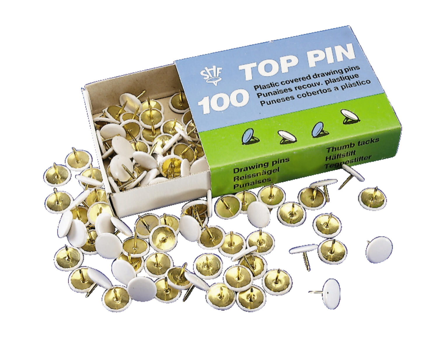 100 st/fp. 9 mm mässingsstift med vitt huvud av celluloidplast.