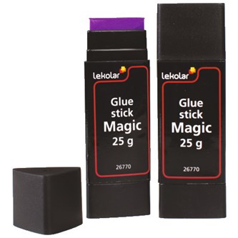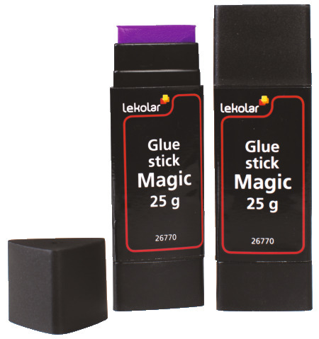 12 st/fp. Lila lim där du direkt kan se var limmet är applicerat. Limmet är lila när du limmar och och torkar sedan magiskt transparent. Vattenbaserat. Limmar de flesta material. Trekantig hylsa av PP.