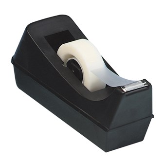 Tejphållare med tyngd för tejp 10-33 m. Maxbredd på tejp 19 mm. Löst hjul för enkelt utbyte av tejprulle. Står stadigt på underlägg av EVA för antiglid. Taggad stålkant för avrivning. Tillverkad av polystyren. Rengörs med fuktig trasa.