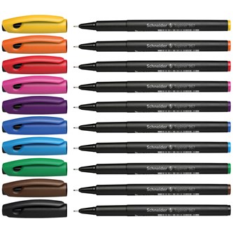 10 st/ask. 10 olika färger. Fiberspetspenna med metallförstärkt spets. För skrivning, teckning och skissering. Vattenbaserat bläck. Skrivlängd ca 2 000 m. Torkar inte utan kork. Pennkropp i polypropen.