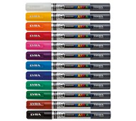 12 st/fp. Permanent märkpenna med konformad spets. Lämplig för märkning på glas, porslin, sten, metall, plast, kartong m.m. Kan ligga utan kork i upp till 7 dagar. Skrivbredd 1-3 mm. Pennkropp av aluminium.